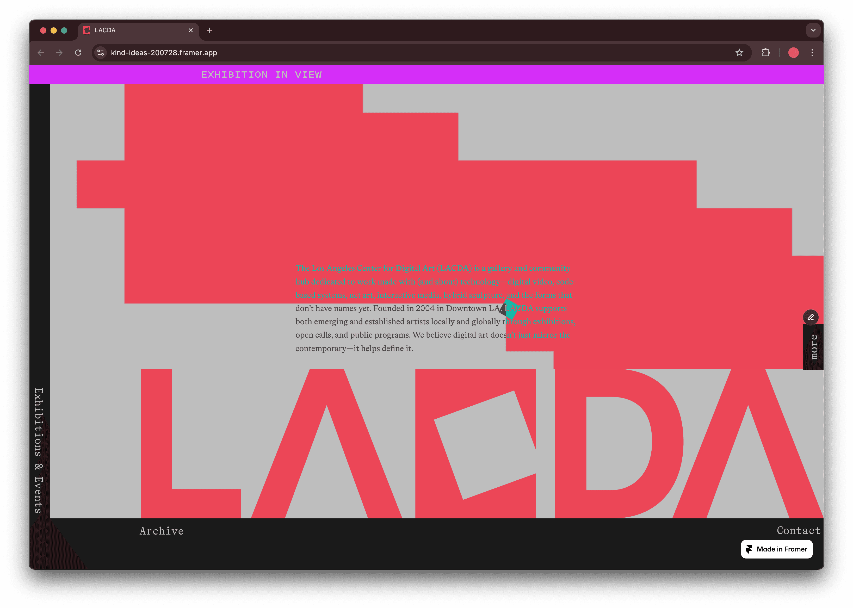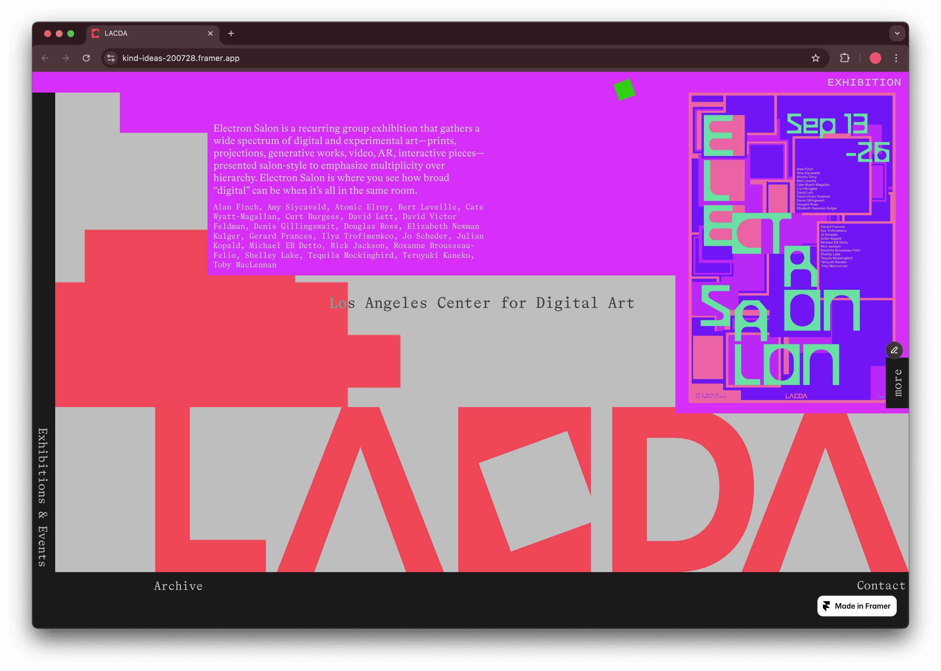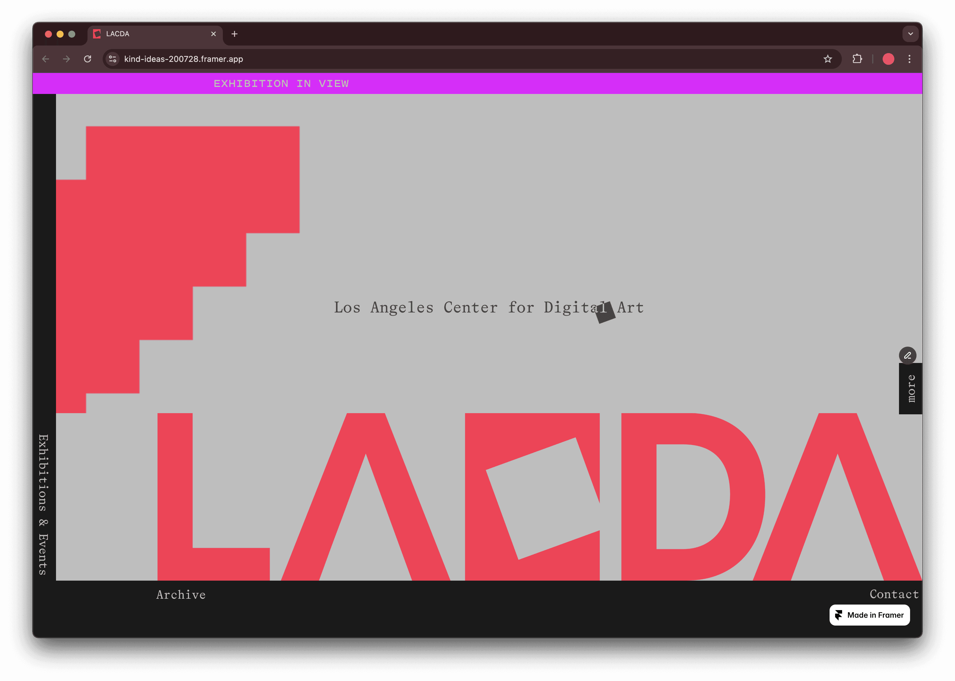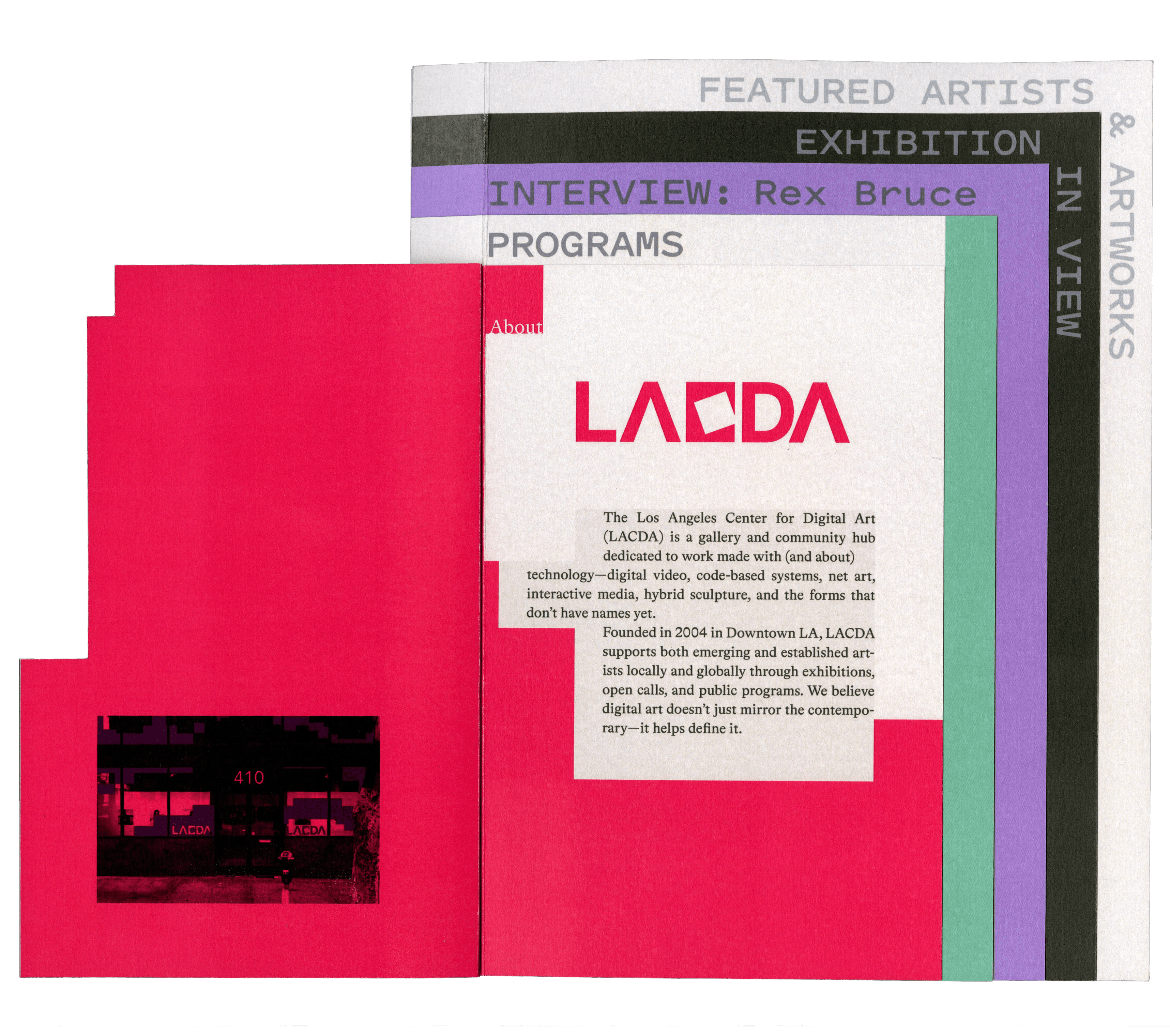 The Los Angeles Center for Digital Art (LACDA), established in April 2004, acts as a gallery for the display of digital artworks in Los Angeles, California.