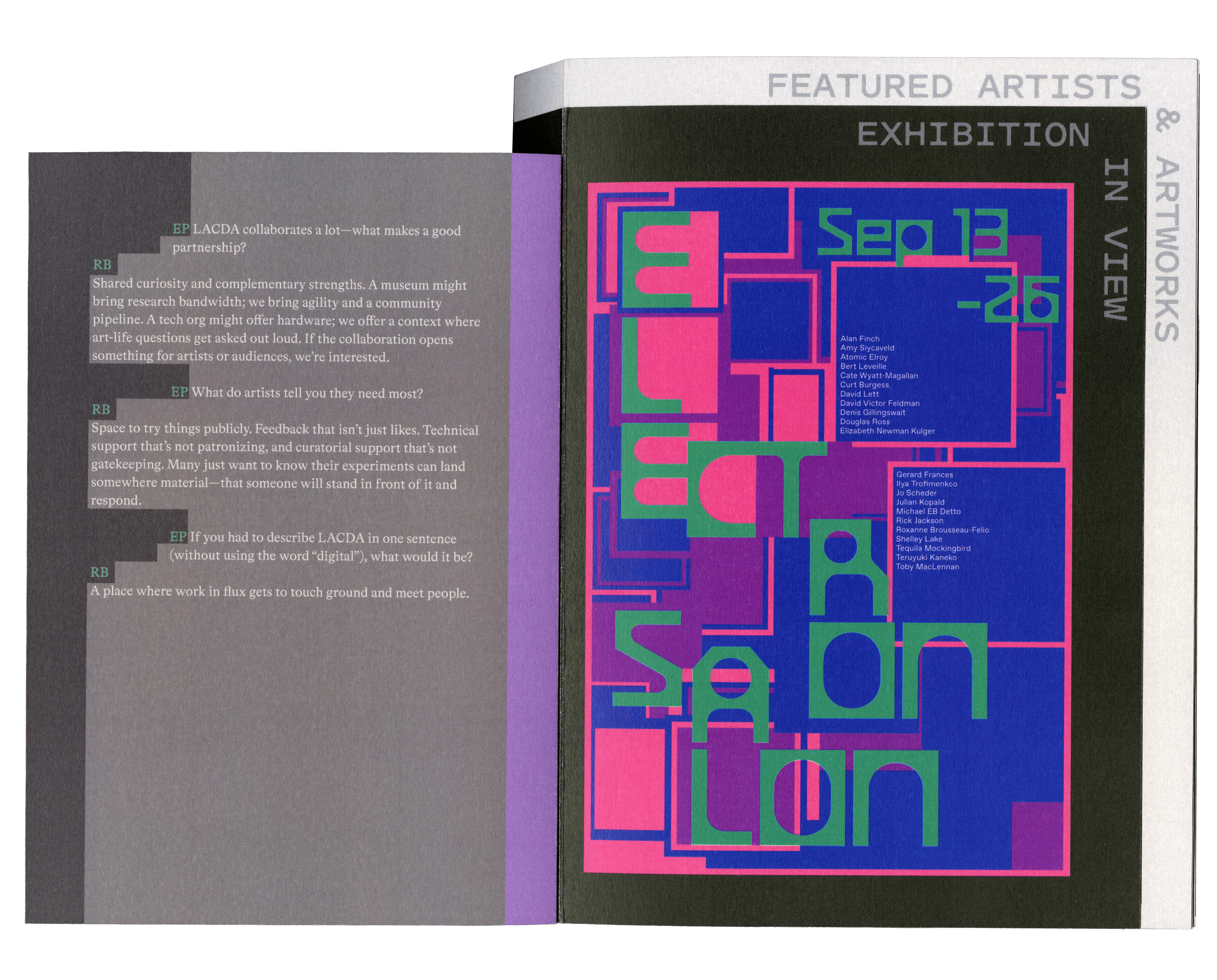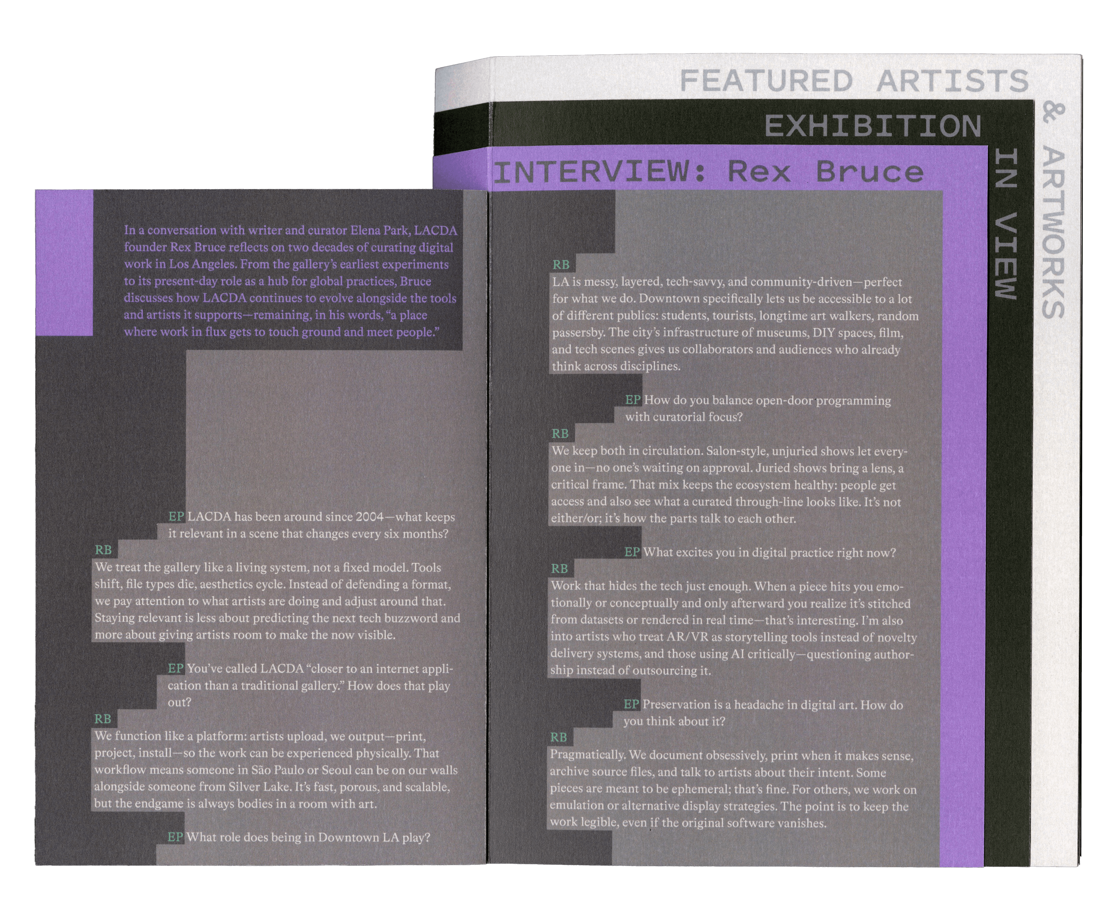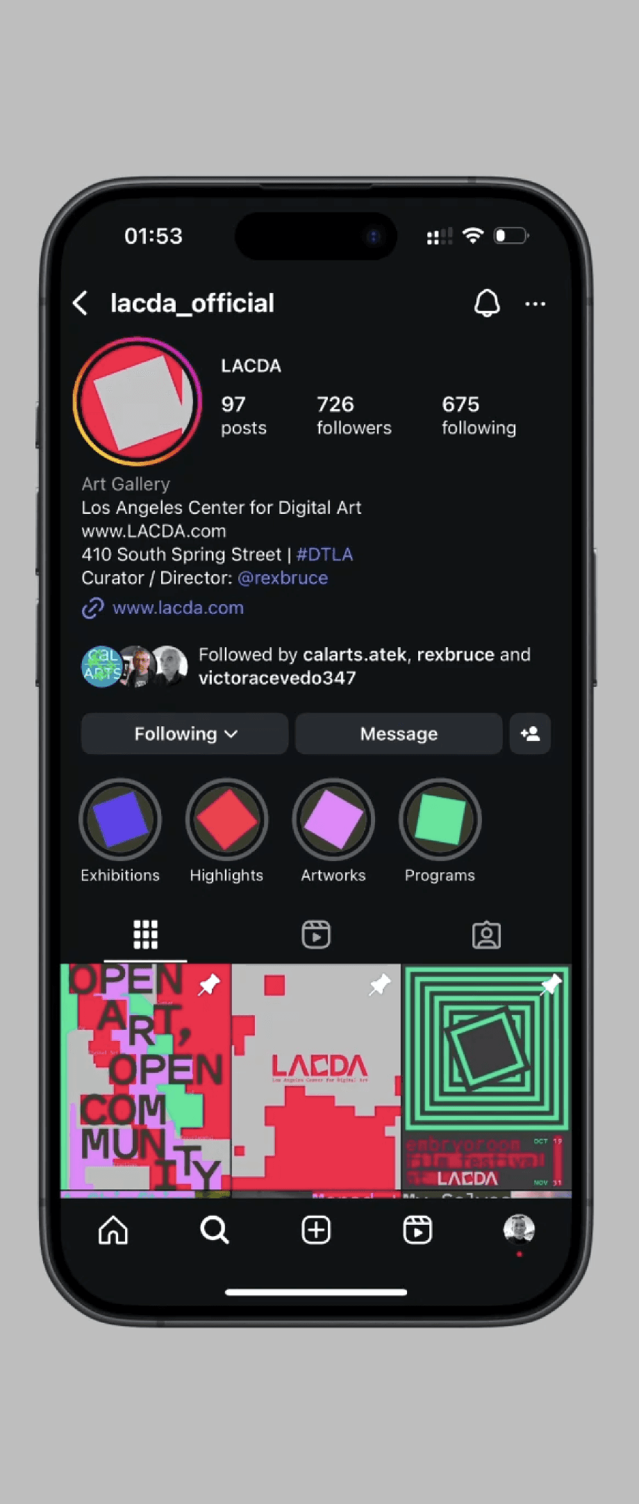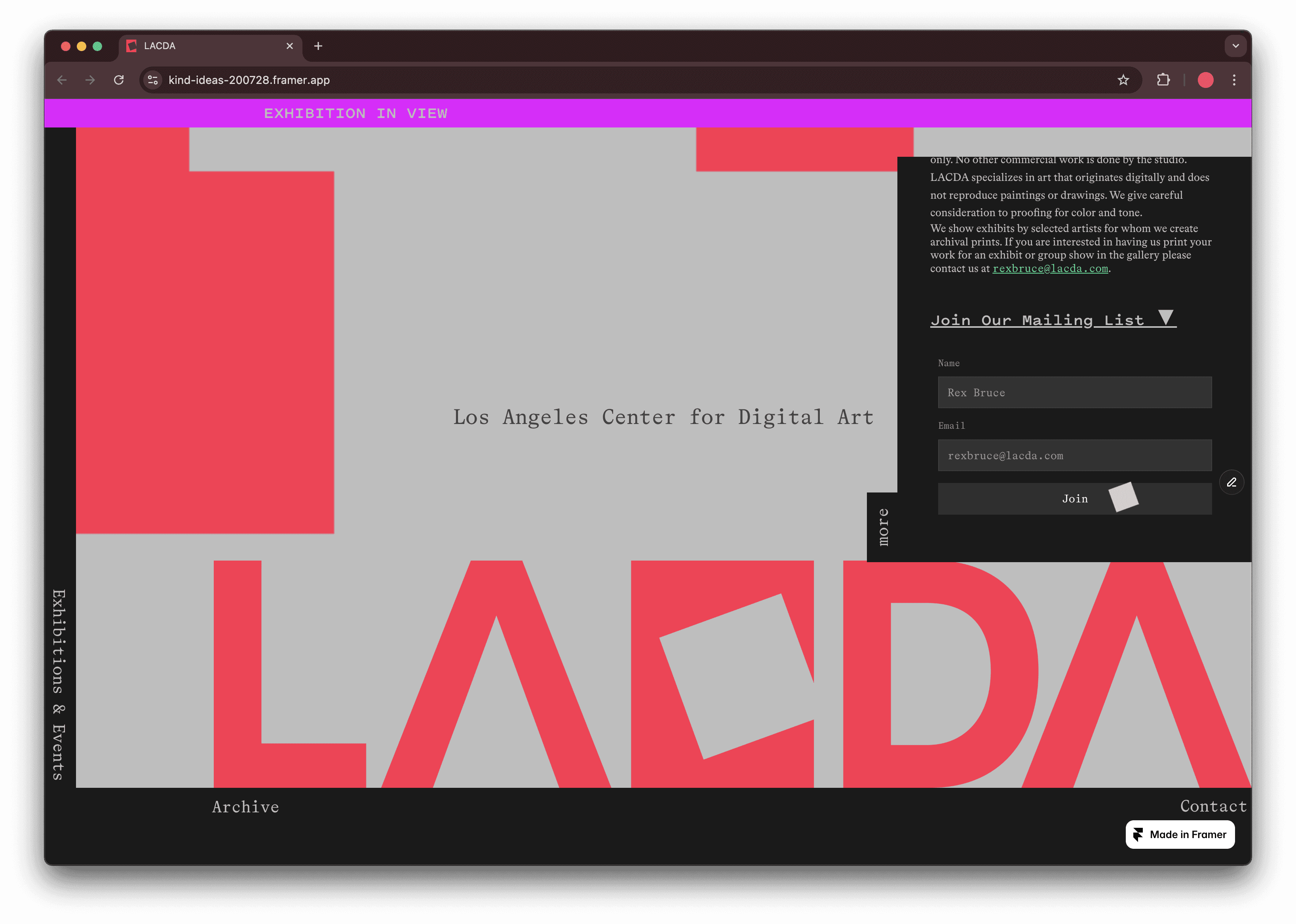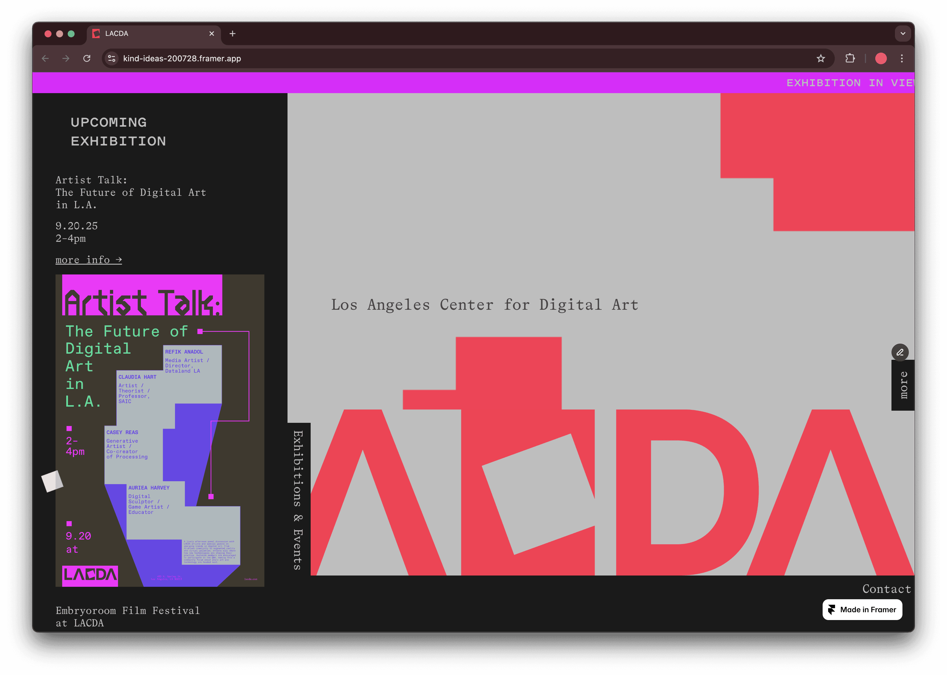 The Los Angeles Center for Digital Art (LACDA), established in April 2004, acts as a gallery for the display of digital artworks in Los Angeles, California.