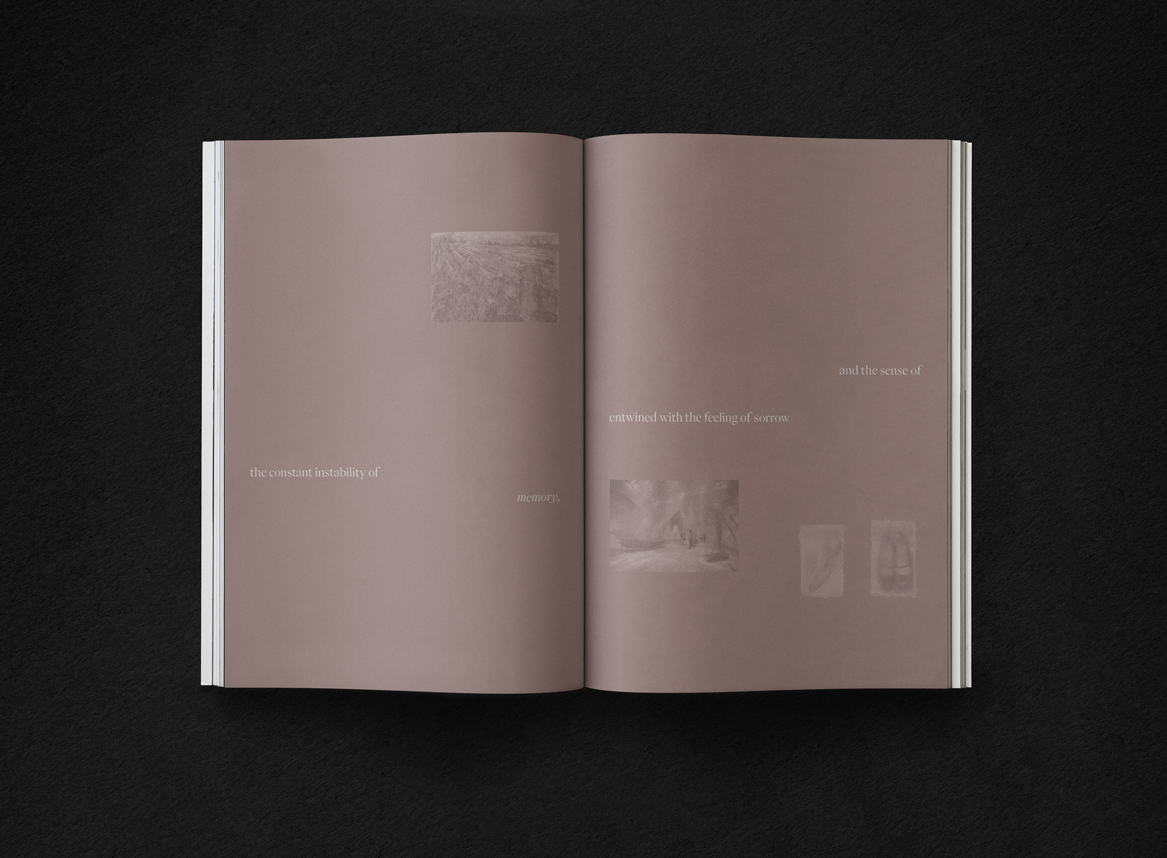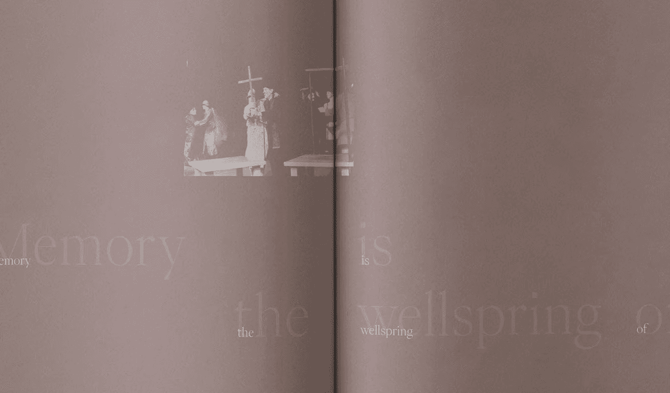 The typography used for the catalog, walls, and posters reflects the essence of memory—forgetting, recalling, and the lingering impression of an afterimage. Images are sequenced through deliberate visual and semantic pairings, creating continuity between each image and the next, and inviting the reader to move through the work as one might move through memory itself.