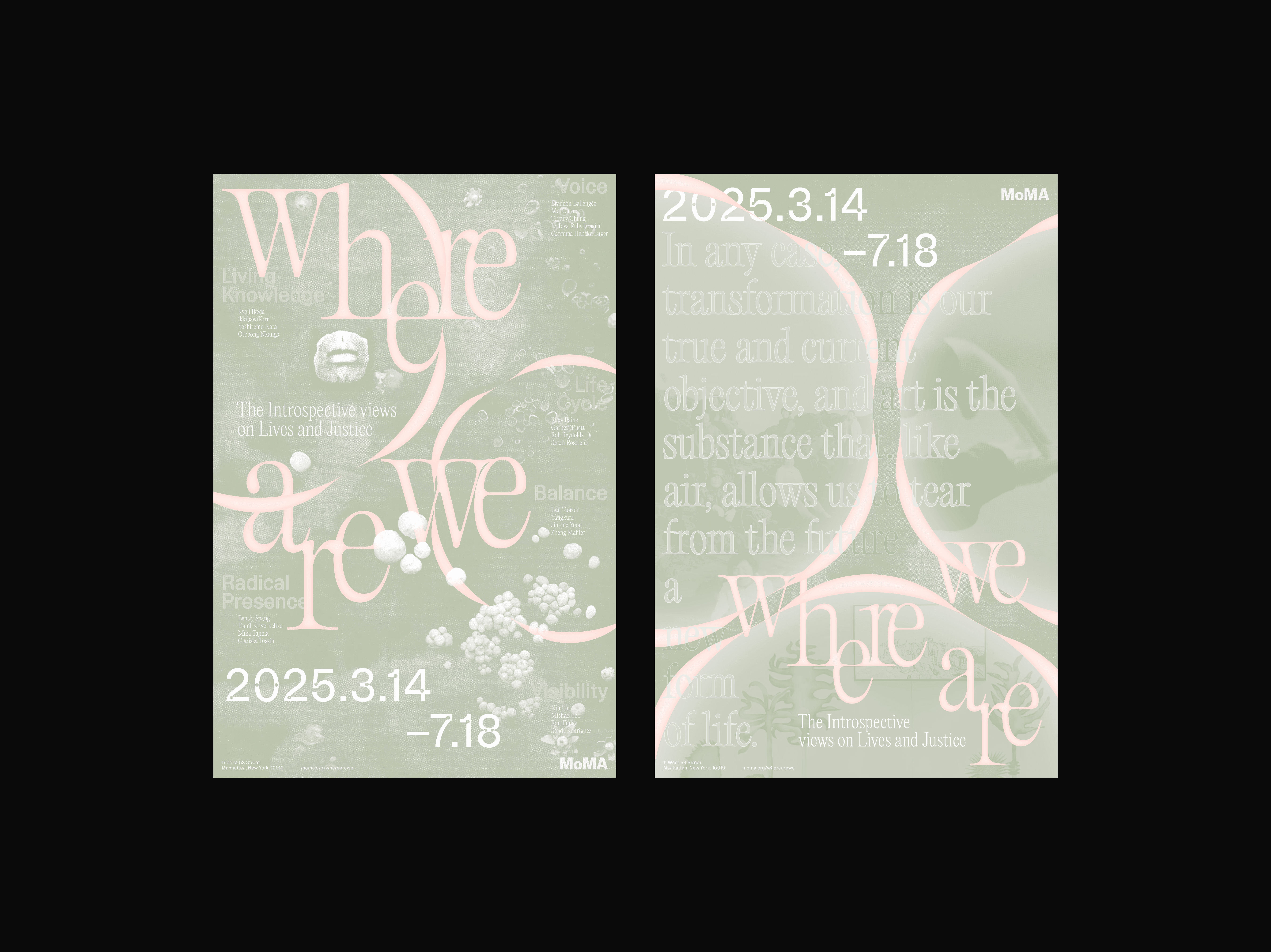 where are we: The Introspective views on Lives and Justice is an identity project for a reimagined exhibition (original: Breath(e)). The exhibition explores pressing issues related to the ethics of climate justice, while proposing pragmatic and philosophical approaches to spur discussion and resolution. The new title poses a question that invites reflection on our existence—who we are and where we belong.